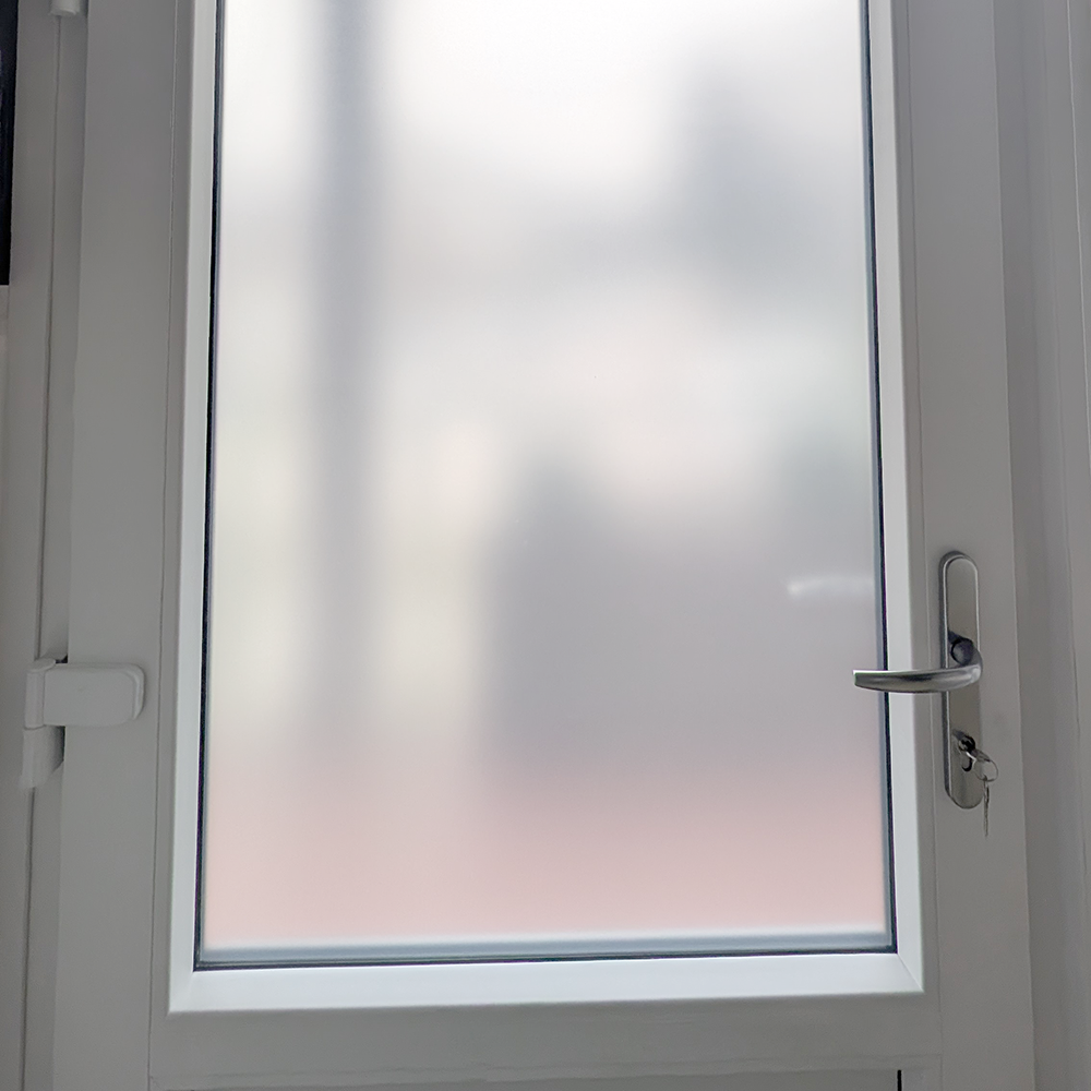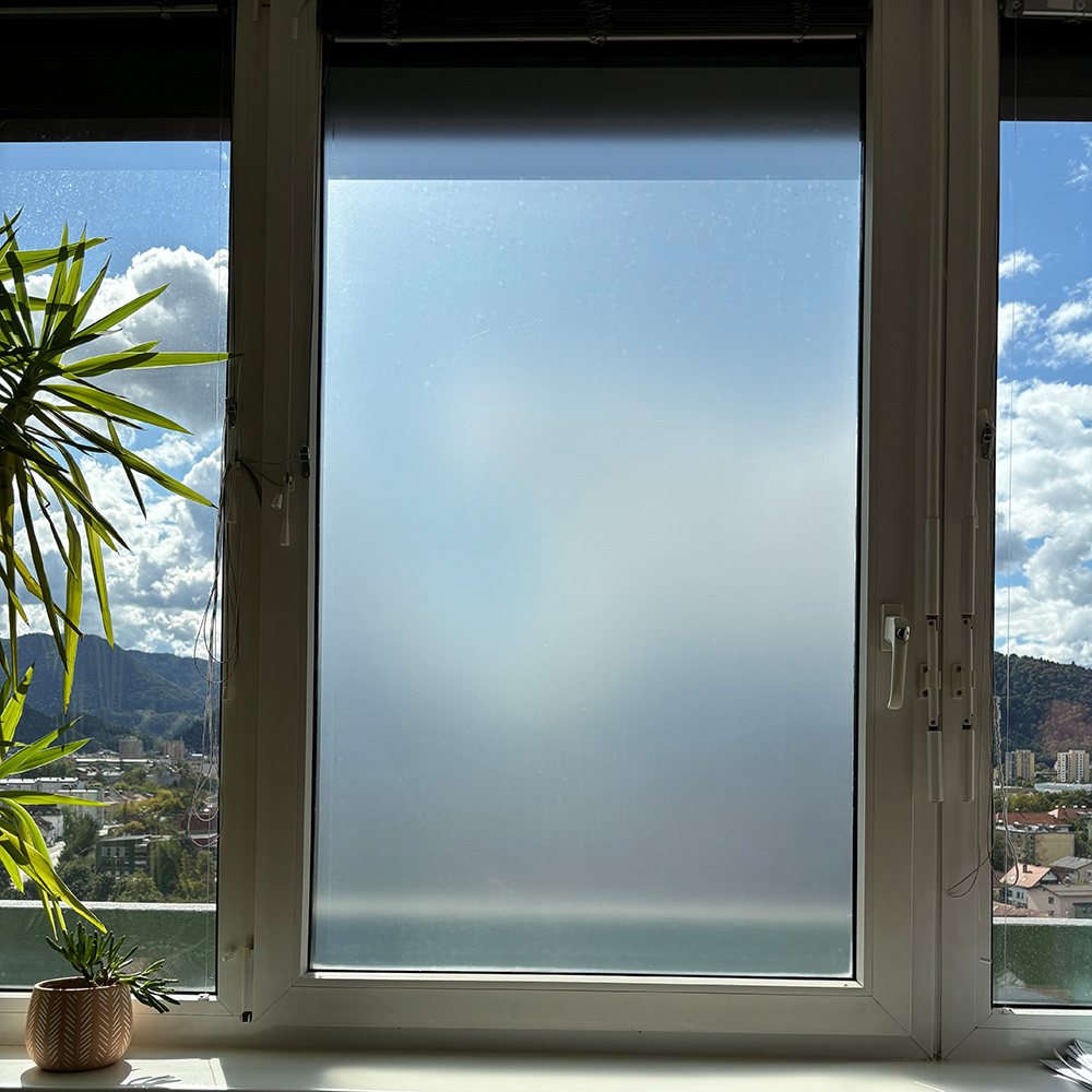 - Frosted Vinil: Peskana ali mlečna folija nudi zasebnost, hkrati pa omogoča, da difuzna svetloba vstopi v prostor. Doda eleganten pridih oknom in je idealen za prostore, kjer je želena zasebnost brez kompromisov pri naravni svetlobi.